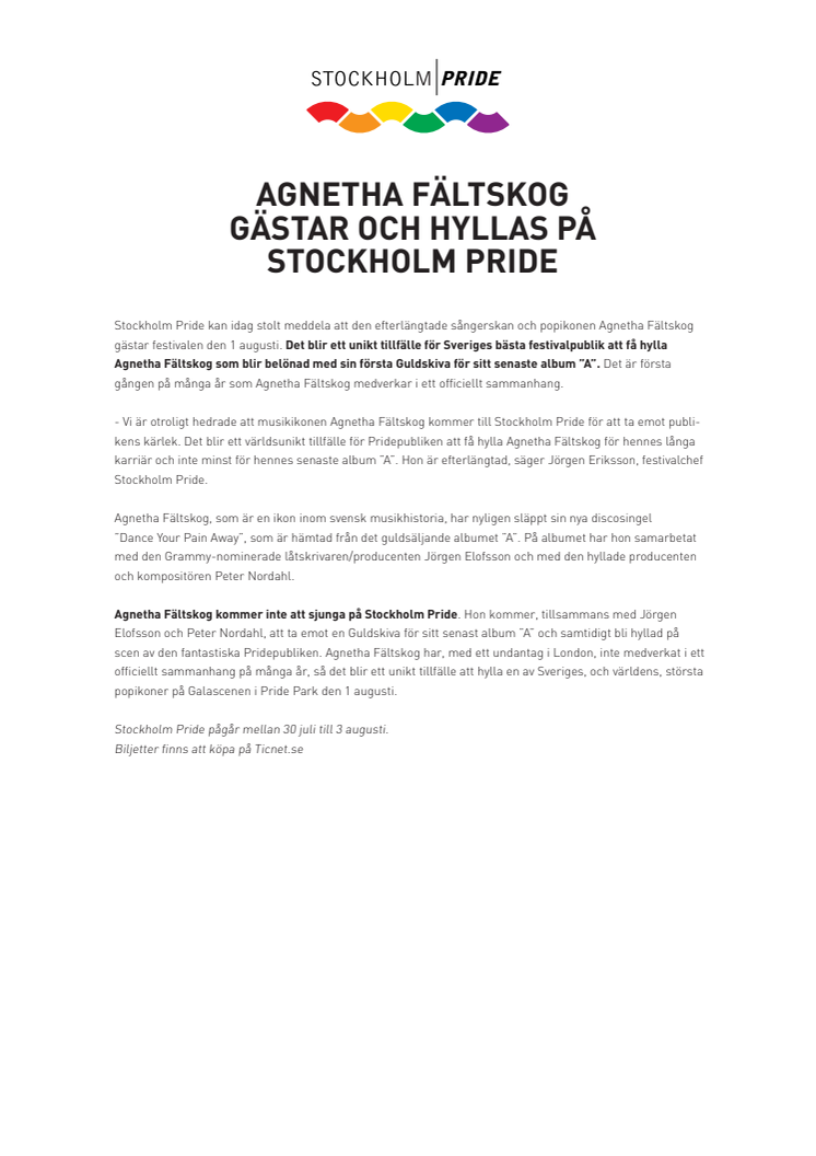 Stockholm Pride kan idag stolt meddela att den efterlängtade sångerskan och popikonen Agnetha Fältskog gästar festivalen den 1 augusti. Det blir ett unikt tillfälle för Sveriges bästa festivalpublik att få hylla Agnetha Fältskog som blir belönad med sin första Guldskiva för sitt senaste album ”A”. Det är första gången på många år som Agnetha Fältskog medverkar i ett officiellt sammanhang.