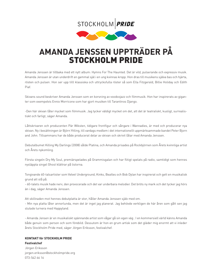 - Amanda Jensen är en musikaliskt spännande artist som vågar gå sin egen väg . I en kommersiell värld känns Amanda både genuin som person och som förebild. Dessutom är hon en grum artisk som det gläder mig enormt att vi inleder årets Stockholm Pride med, säger Jörgen Eriksson, festivalchef.