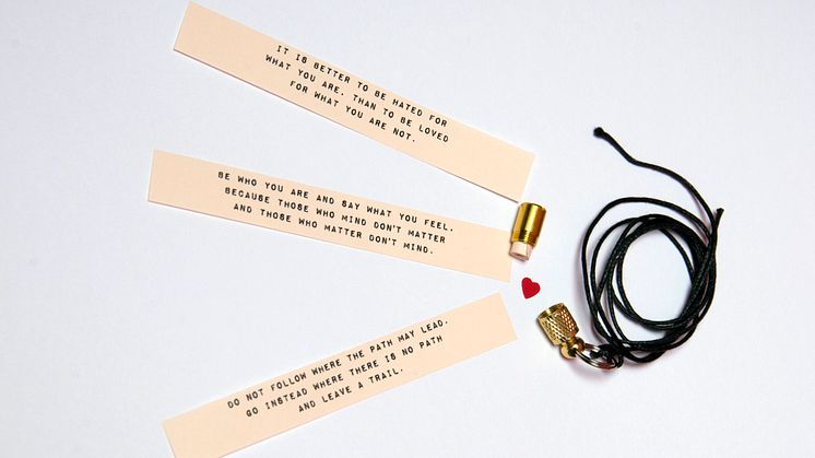 ‑ När man känner sig förvirrad och helt desorienterad, när man har glömt bort vem man är och har anpassat sig efter samhällets så kallade ”normala” normer, då ska min dogtag vara som en kompass och som en påminnelse. Budskapet på lappen tillsammans med konfettin ska få innehavaren att komma ihåg att han eller hon inte är ensam och ge styrka och en gnutta glamour.