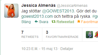 - Tack vare alla som stöttat och ställt sig bakom kampanjen har vi nått ett av våra mål. Nu är ambitionen att #gowest blir ett trending topic i hela Ryssland, säger Jessica W Sandberg, kampanjchef för #GOWEST.