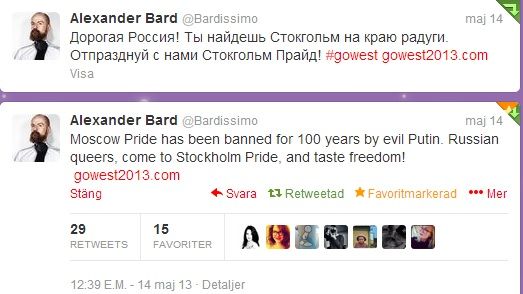 - Vi i Sverige har möjlighet att ta stafettpinnen och se till att kampen för Rysslands hbtq-personer inte går Putin förbi. I maj lanserade vi kampanjen #GoWest just för att uppmärksamma världen på hur situationen för hbtq-personer i Ryssland ser ut. Om vi tillsammans ser till att #GoWest ännu en gång blir ett trending topic i Ryssland kan vi räkna med att Putin får vetskap om att Sverige står bakom landets hbtq-aktivister och deras frihetskamp, säger Peter Rimsby, ordförande för Stockholm Pride.